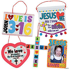 • 12 Wooden Color Your Own Jesus Loves Me Picture Frame Magnets (4 1/2″ x 6 3/4″ with a 3″ x 4 1/4″ photo space.)• 12 Love Is John 3:16 Sign Craft Kits (Includes self-adhesive foam pieces and satin cording. 8″ x 6″)